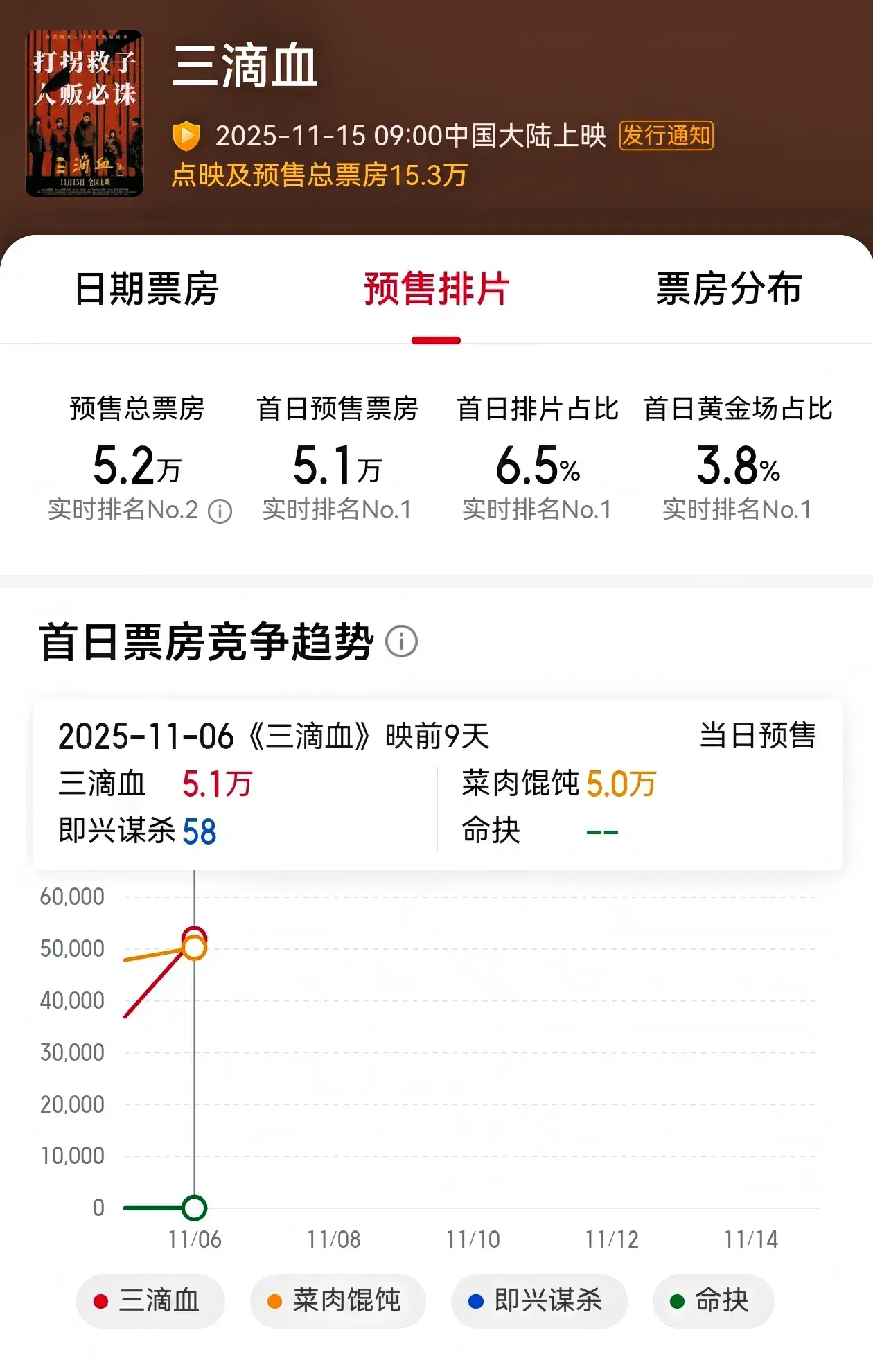《三滴血》这部电影已经是官宣比较久了,而在这部影片中胡歌罕见饰演了反派角色,而主题方面也是我国首部揭露“家族式人口贩卖产业链”的犯罪片,取材都是来自公安部中真实打拐案件改编,说实话可以说看点十足了,但是目前猫眼App上面,这部电影的预售总票房才5万,这是不是太少了呢?完全是要扑街的节奏啊!
