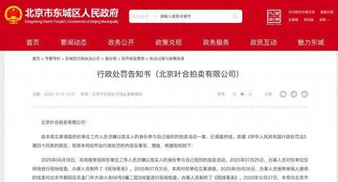 行政处罚告知书显示,2025年6月,北京市东城区市场监督管理局接到举报称,叶合拍卖工作人员涉嫌以竞买人的身份参与自己组织的拍卖活动。2025年7月,办案人员对该公司住所地进行现场检查,随后该局立案调查。